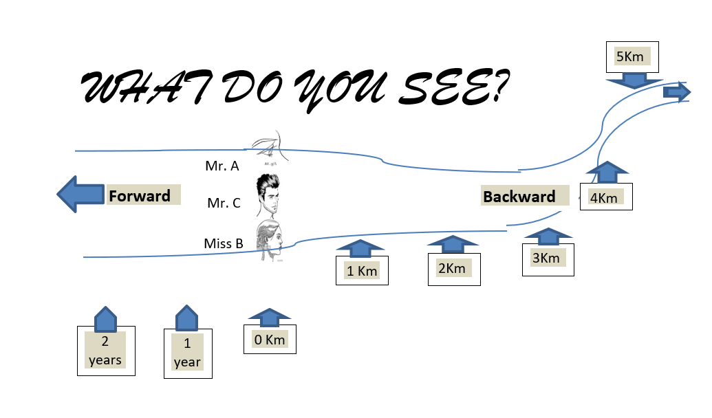 what you see, how much can you see, and how deep and far can you see, whether, in the past or the future. There is a road marked with (kilometer) milestones. One arrow shows forward and the other backwards indicating the directions in life, while you stand at a pint. You have seen these things in past, and are familiar with. This road you have travelled in the past. Those at the 0 KM are looking backwards, and trying to see, what all they could, and how deep. It was at a, and for a fixed moment in time. It is not what they saw at different timings. We all; the readers, are being represented by these three only.